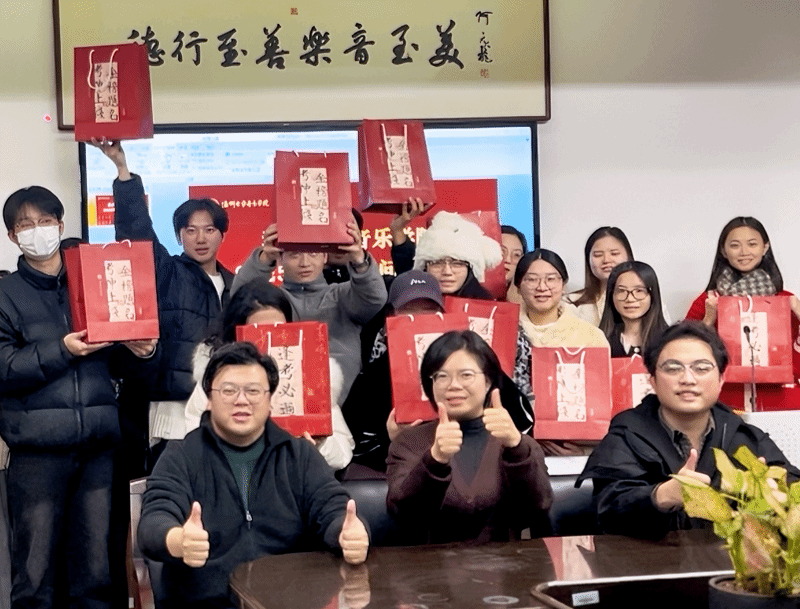 紧接着,现场的老师们亲手为每位考研学子递上了满载深情厚意的考研福袋。这些福袋中不仅包含了贴心的抗压零食,还有精致的祝福卡片,以及寓意“金榜题名”的可乐和未来可期的笔记本套装,每一份礼物都凝聚着学院对学子们的深切关怀与美好祝愿。